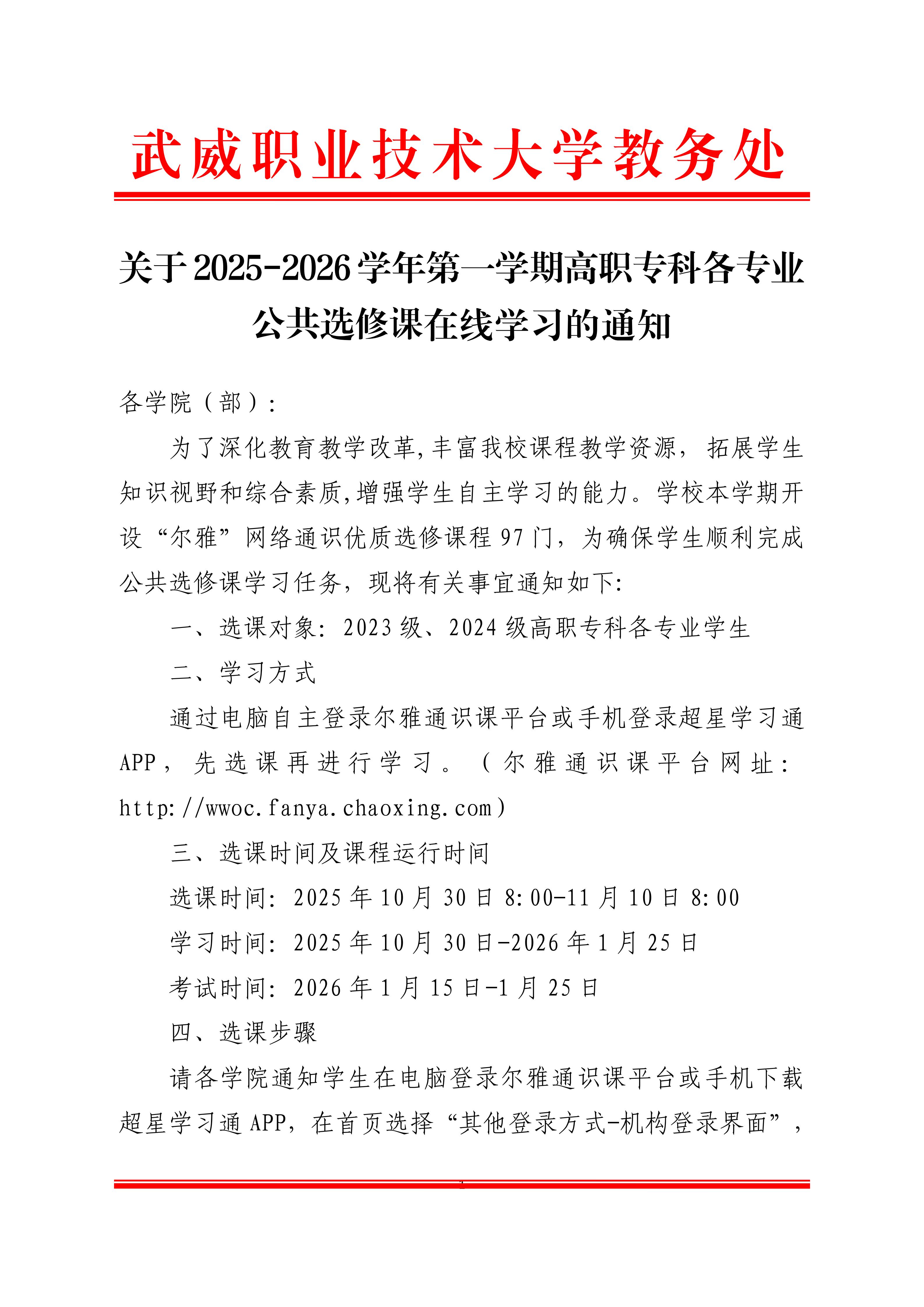關(guān)于2025-2026學(xué)年第一學(xué)期高職專(zhuān)科各專(zhuān)業(yè)公共選修課在線學(xué)習(xí)的通知
