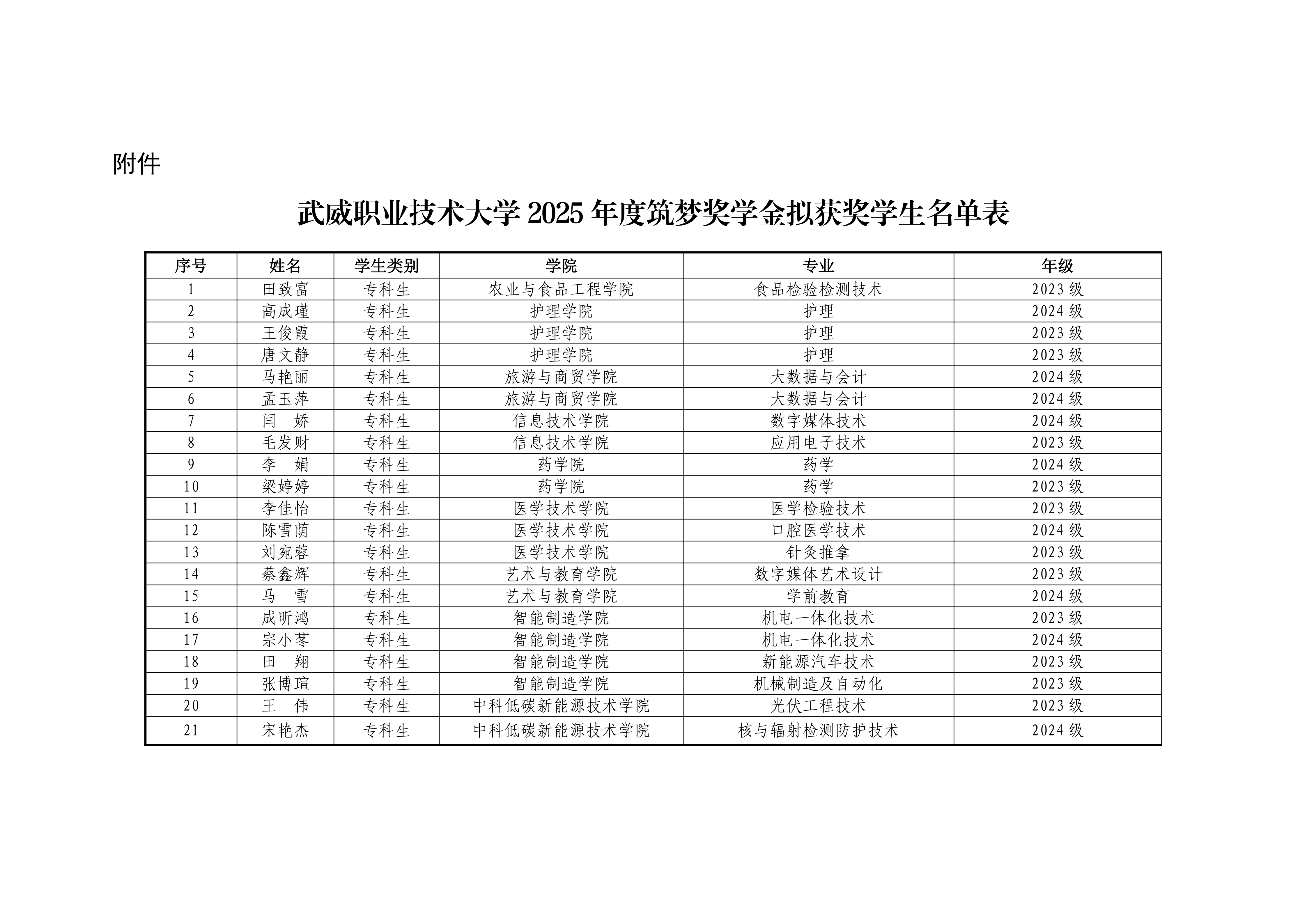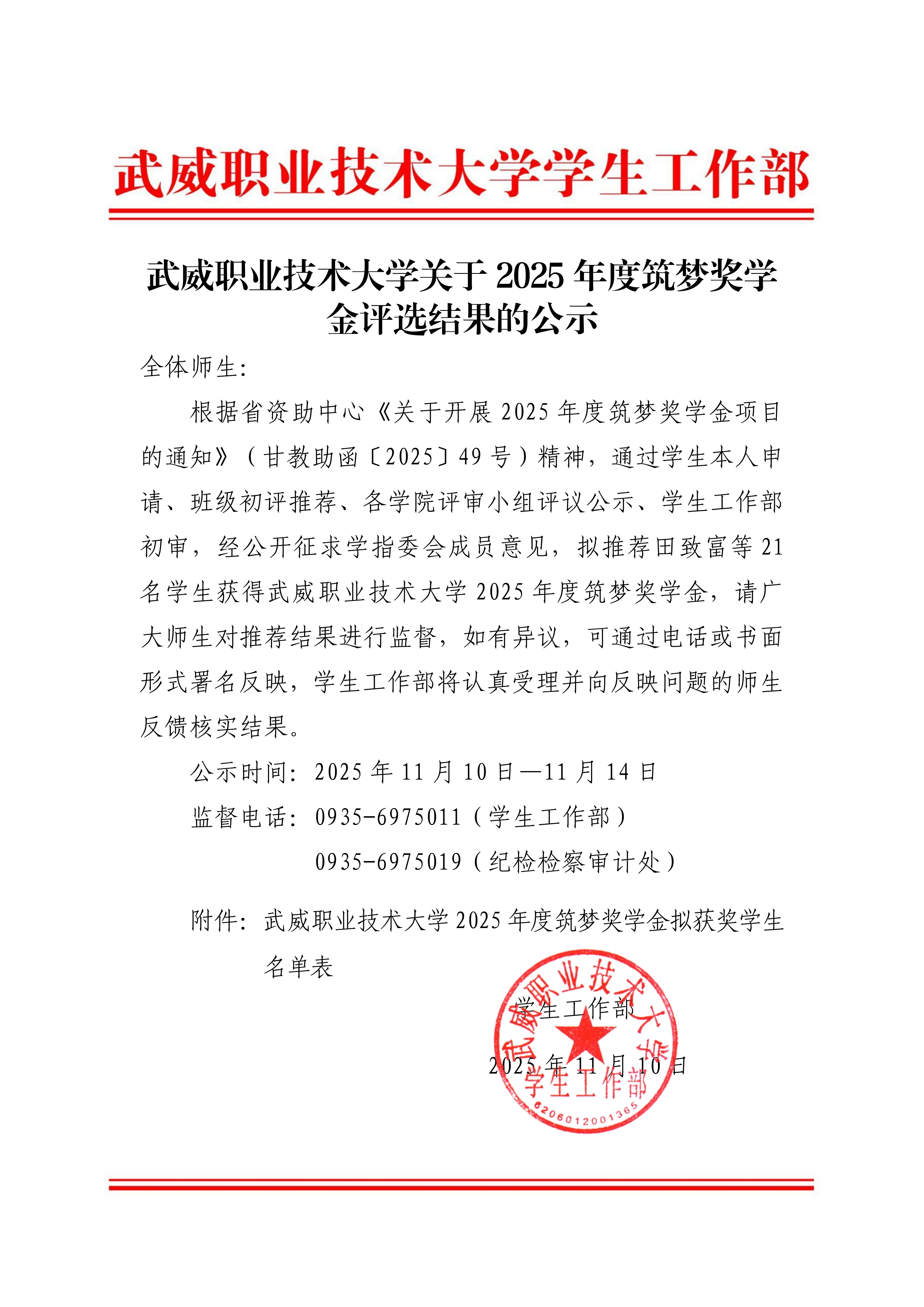 武威職業(yè)技術(shù)大學(xué)關(guān)于2025年度筑夢獎學(xué)金評選結(jié)果的公示