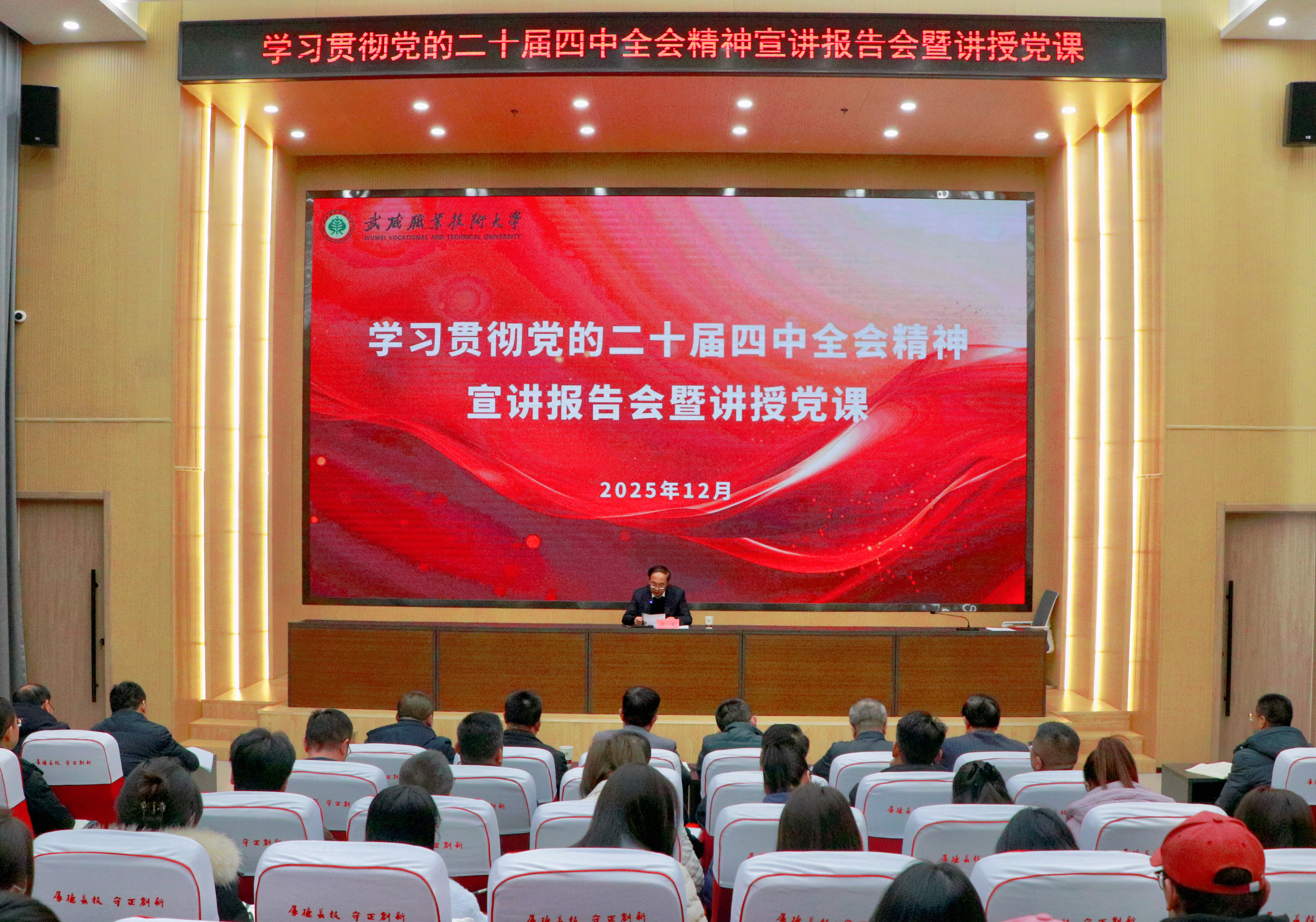 12月10日,黨委書記王宏專題宣講黨的二十屆四中全會精神,并向師生講授黨課。他強調(diào),要深入學習貫徹黨的二十屆四中全會精神,全面把握核心要義,立足職業(yè)本科教育新起點,奮力譜寫學校高質(zhì)量發(fā)展新篇章,為加快推進中國式現(xiàn)代化武威實踐貢獻智慧力量。黨委副書記、副校長張開禮主持報告會。