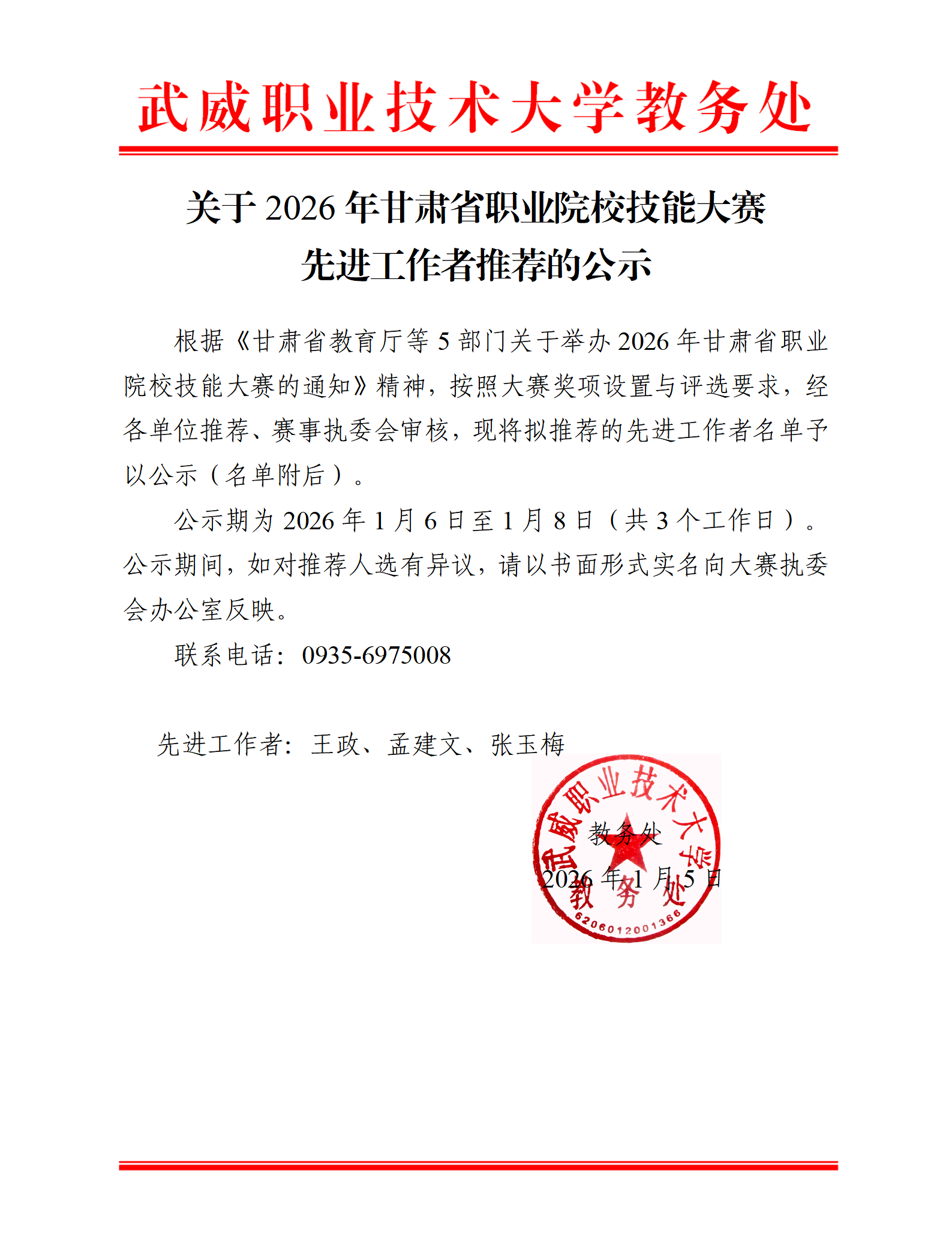 關于2026年甘肅省職業(yè)院校技能大賽先進工作者推薦的公示