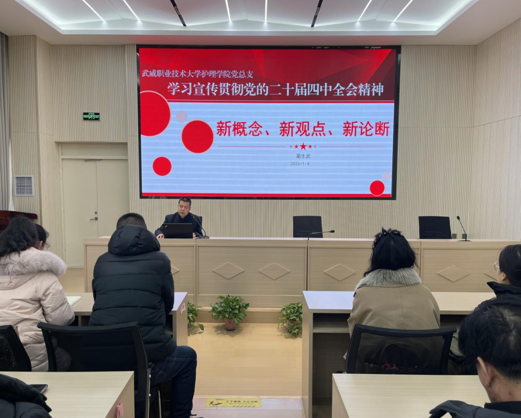 為深入學(xué)習(xí)貫徹黨的二十屆四中全會精神,準(zhǔn)確把握國家“十五五”時期發(fā)展藍(lán)圖與戰(zhàn)略部署,護(hù)理學(xué)院于1月4日下午在圖書館報(bào)告廳召開專題宣講會。學(xué)院黨總支書記藺生武作宣講報(bào)告,全體教職工、入黨積極分子及學(xué)生代表等80余人參加。