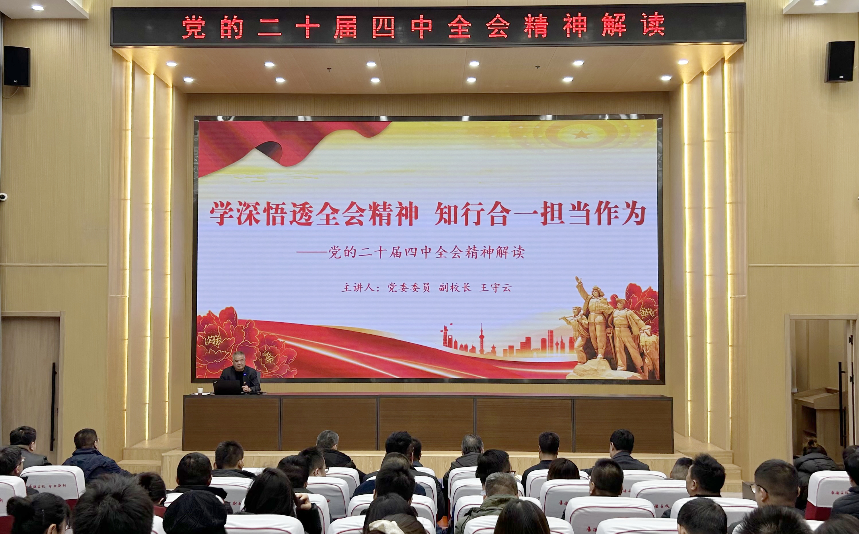 12月26日,黨委委員、副校長王守云在能源科技樓學(xué)術(shù)報告廳,為藝術(shù)與教育學(xué)院、旅游與商貿(mào)學(xué)院、創(chuàng)新創(chuàng)業(yè)學(xué)院及教師第二黨支部師生講授專題黨課,深入解讀黨的二十屆四中全會精神。各學(xué)院黨員、預(yù)備黨員、入黨積極分子及師生代表共100余人參會。